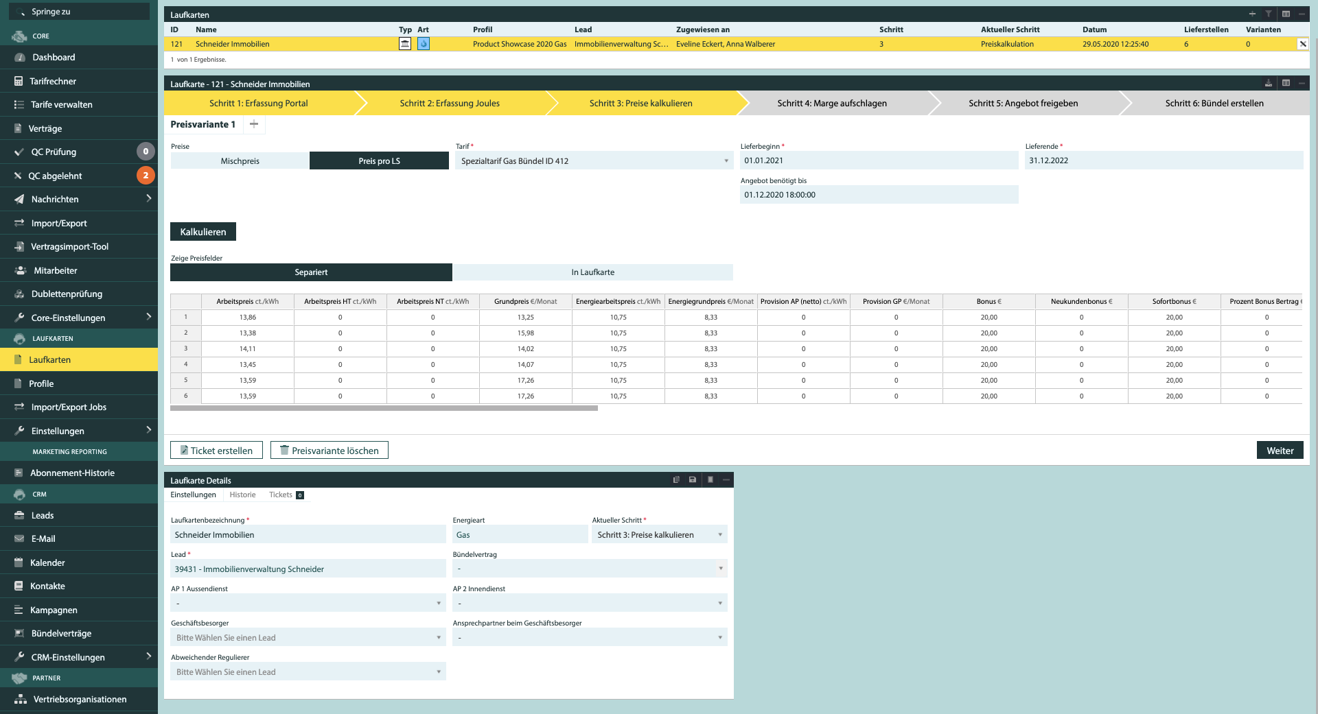 Sobald der Kunde die Datenerfassung abgeschlossen hat, wird der Vertriebsmitarbeiter auf Seiten des Energieversorgers durch eine Mail informiert, dass der Kunde nun auf ein Angebot wartet. Der Vertriebsmitarbeiter kann die Lieferstellendaten nun im Backend bei Bedarf nachbearbeiten, um sie für das Pricing vorzubereiten. Er hat dabei die Möglichkeit, mehrere Angebotsvarianten auf einmal anzufordern, beispielsweise um dem Kunden die Option eines reinen Energiepreises, und eine Option mit Grund- und Arbeitspreis zum Vergleich vorzulegen. Das Pricing erfolgt standardmäßig über das Joules Modul CALC; es ist aber ebenso möglich, ein externes Kalkulationstool eines Fremdanbieters über eine Datenaustausch-Schnittstelle anzubinden. Bei einer Kalkulation via CALC werden nun für alle 50 Lieferstellen in den angeforderten Angebotsvarianten Preiskomponenten an die virtuelle "Laufkarte" angefügt. Das beinhaltet neben dem Energie-Einkaufspreis auch Netzentgeltdaten, sowie Abgaben und Steuern.